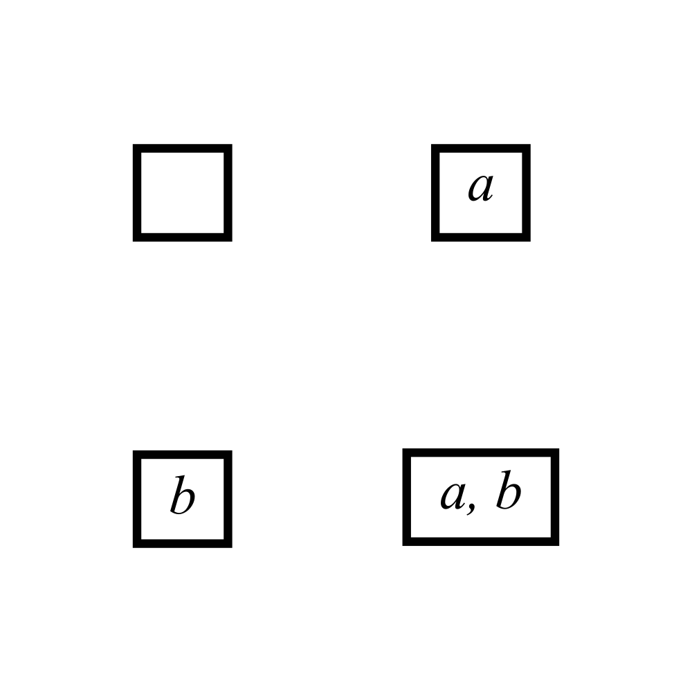 Let’s look at subsets of the set \(\{a, b\}\). We have the possibilities, which we name Empty, A set, B set, Universal set: