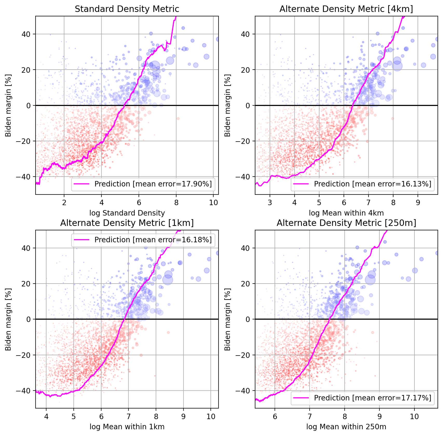 Instead, here’s a sampling of 1000 voters and what their neighborhoods look like. This has the benefit of giving you a picture of what Biden’s America and Trump’s America look like: not two disjoint nations, but two overlapping and intertwined distributions. You can click each dot to jump down to the voter represented by the dot.