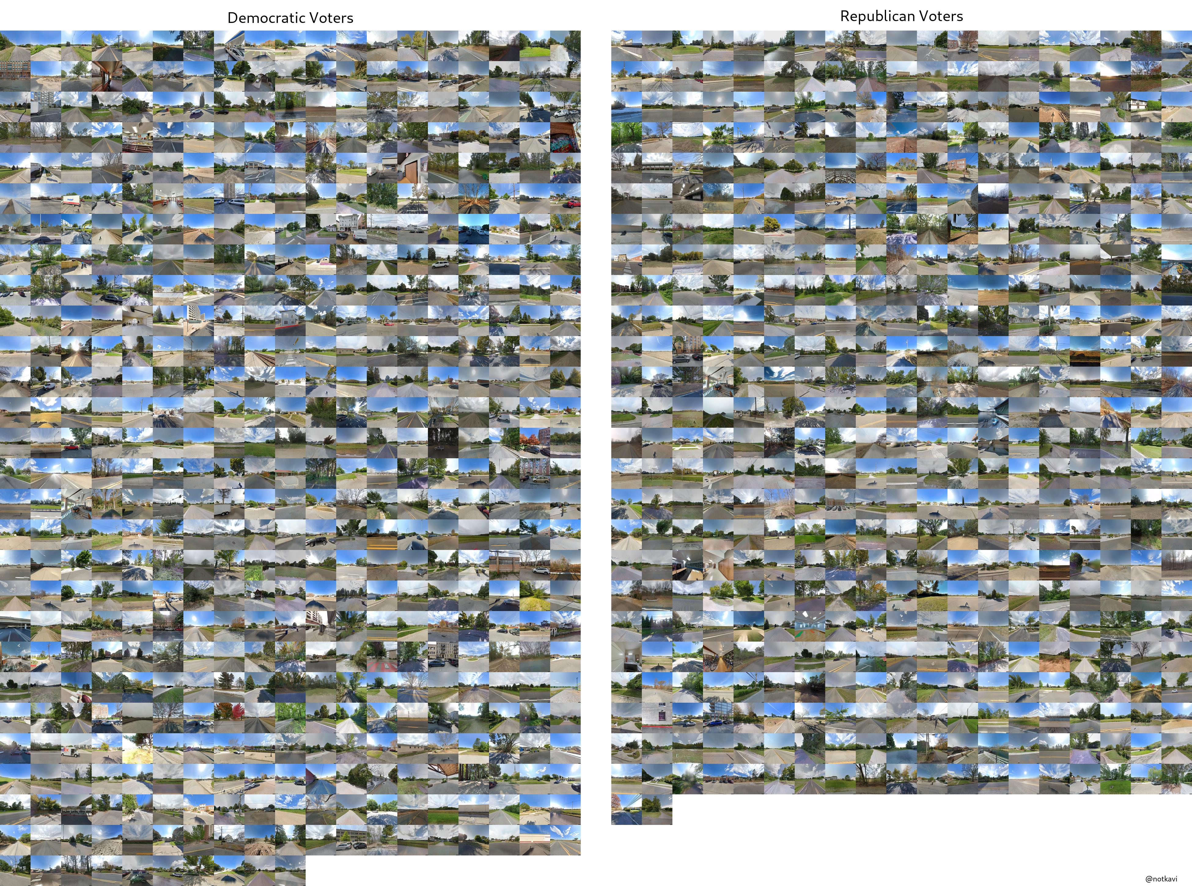 Technical details: to sample the voters I first figured out how many Trump and how many Biden voters should be picked, then for each candidate I sampled precincts randomly, weighted by how many of that candidate’s voters lived in the precinct. I excluded Kentucky from this sampling as I do not have precinct data for Kentucky. The precinct data is from a combination of the NYT and VEST and I try to find a street with a “street-like” address (so not a freeway or major road) inside the precinct, whenever possible. The images should be taken as a broadstrokes vibe of the precinct rather than something super specific.